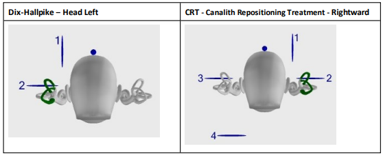 Ένα παράδειγμα διαγνωστικής δοκιμασίες και θεραπευτικού χειρισμού με τη χρήση του τρισδιάστατου μοντέλου δίνεται παραπάνω. Οι ημικύκλιοι σωλήνες που ελέγχονται είναι με πράσινο χρώμα (στη συγκεκριμένη εξέταση ο πρόσθιος και ο οπίσθιος). Καθώς εκτελείται ο χειρισμός η μπλε τελεία μετακινείται μαζί με το κεφάλι. Ανάλογα με τη δοκιμασία ή τον χειρισμό που εκτελείται κάθε θέση που πρέπει να λαμβάνεται, χαρακτηρίζεται από έναν αριθμό και απεικονίζεται με μία μπλε κάθετη γραμμή. Ο εξεταστής μετακινεί το κεφάλι, ώστε η μπλε τελεία να λαμβάνει διαδοχικά τις αριθμημένες θέσεις, που αναπαριστώνται από τις μπλε κάθετες γραμμές.