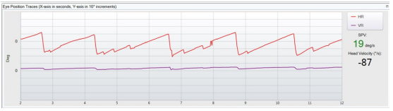 Η κόκκινη γραμμή αντιστοιχεί στην κίνηση των ματιών στο οριζόντιο επίπεδο και η μωβ στο κάθετο. Η τιμή της SPV λαμβάνει πράσινο χρώμα, όταν ο νυσταγμός είναι σχετικά σταθερός και συνεπώς υπάρχει μεγάλη πιθανότητα η τιμή που απεικονίζεται να είναι αξιόπιστη. Αντίθετα, απεικονίζεται με πορτοκαλί χρώμα όταν η τιμή είναι λιγότερο αξιόπιστη και ο νυσταγμός λιγότερο πιθανό να είναι πραγματικός.